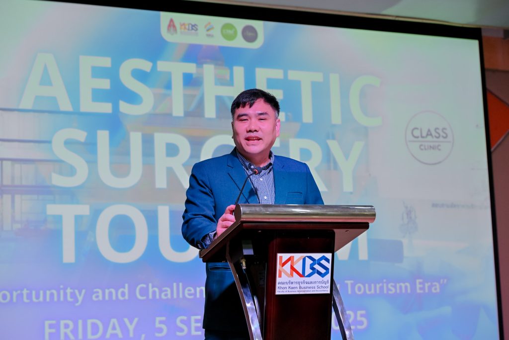 Within this seminar, there were presentations on the topic “Opportunities for Khon Kaen Province to Become a Center for Aesthetic Surgery Tourism,” provided by a speaker from KRM Plastic Surgery Hospital, followed by a presentation titled “Challenges in Expanding Aesthetic Business and Business Models of New Entrepreneurs,” by a speaker from Class Aesthetic Clinic. Additionally, there was an academic panel discussion on “Opportunities and Challenges for Khon Kaen Province in Becoming a Center for Aesthetic Surgery Tourism.”