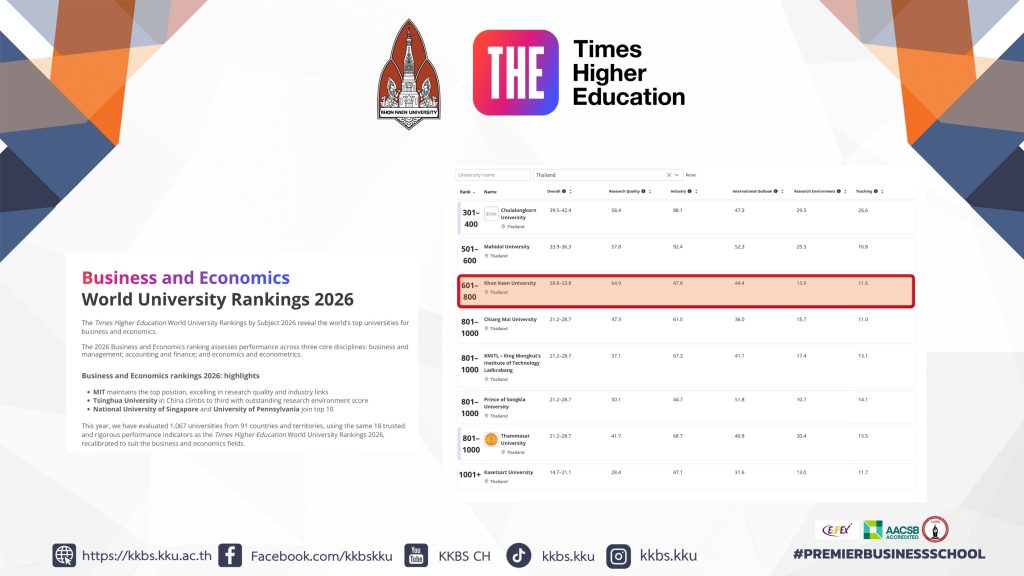 Khon Kaen University (KKU) continues to strengthen its academic standing on the global stage following the announcement of the Times Higher Education (THE) World University Rankings 2026, published on the official THE website. In the World University Rankings 2026 by Subject: Business and Economics, Khon Kaen University is ranked in the 601–800 band globally and 3rd in Thailand. The Times Higher Education rankings are assessed using five key performance indicators: Teaching, Research Environment, Research Quality, Industry, and International Outlook.