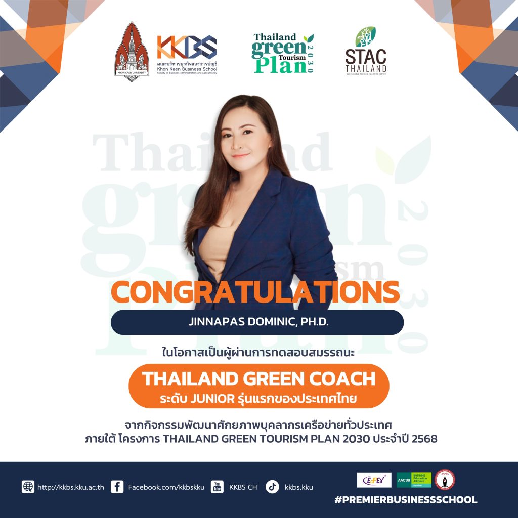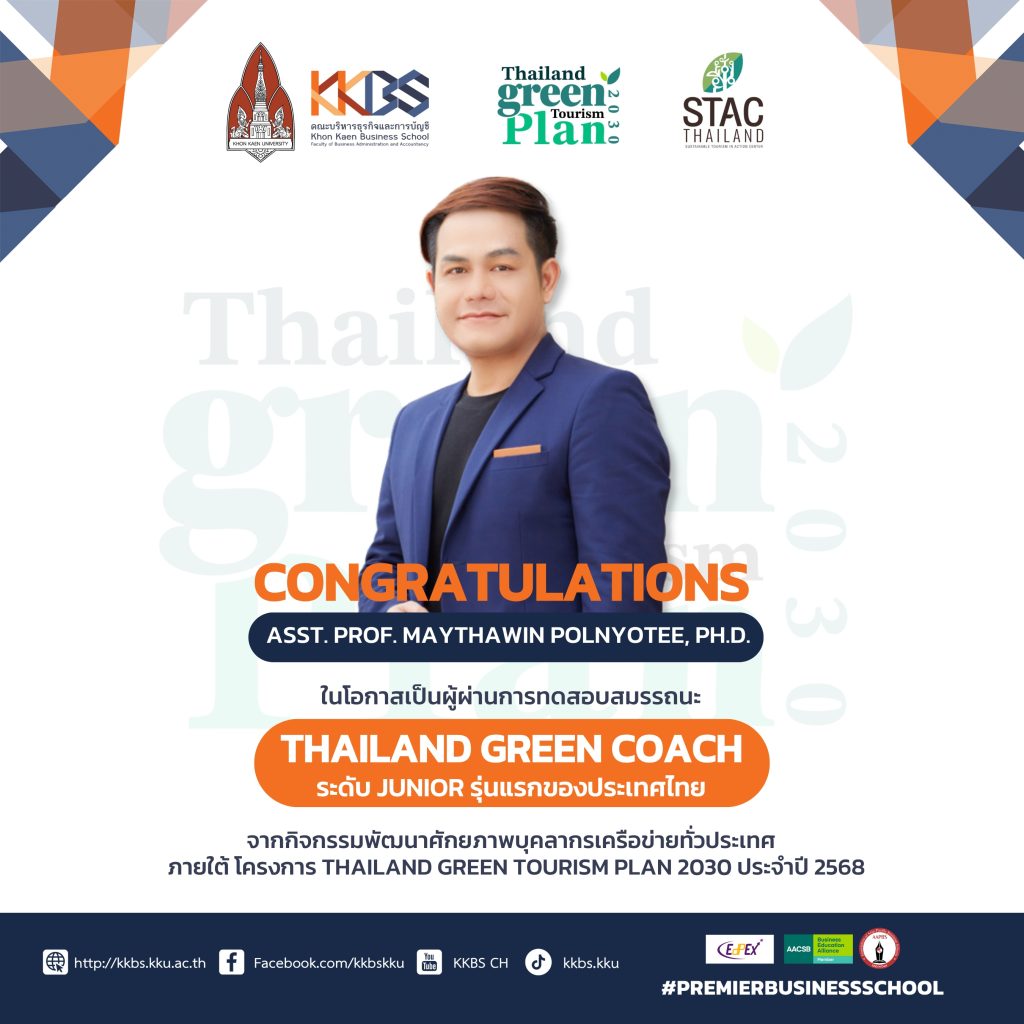 คณะบริหารธุรกิจและการบัญชี มหาวิทยาลัยขอนแก่น ขอแสดงความยินดีกับ ผู้ช่วยศาสตราจารย์ ดร.เมษ์ธาวิน พลโยธี และ ดร.จินณพัษ โดมินิค อาจารย์ประจำหลักสูตรบริหารธุรกิจบัณฑิต สาขาการจัดการนวัตกรรมการท่องเที่ยว ที่ผ่านการทดสอบสมรรถนะ Thailand Green Coach ระดับ Junior รุ่นแรกของประเทศไทยจาก “กิจกรรมพัฒนาศักยภาพบุคลากรเครือข่ายทั่วประเทศ ภายใต้โครงการ Thailand Green Tourism Plan 2030 ประจำปี 2568” ซึ่งจัดโดยกรมการท่องเที่ยวและศูนย์ขับเคลื่อนการท่องเที่ยวยั่งยืนประเทศไทย (STAC) มหาวิทยาลัยมหิดล ระหว่างวันที่ 9–11 กันยายน 2568 และทดสอบสมรรถนะในวันที่ 13 กันยายน 2568 ที่ผ่านมา