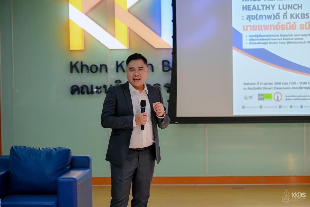 On October 21, 2025, the Faculty of Business Administration and Accountancy, Khon Kaen University, organized the event “Healthy Talk, Healthy Lunch: Well-being at KKBS” under the project for health knowledge exchange and consultancy: Enhancing knowledge and skills for practical implementation to promote proactive health care concepts and create a learning space on wellness. Associate Professor Dr. Pongsutti Phuensane, Dean of the Faculty of Business Administration and Accountancy, delivered the welcome speech and officially opened the event. The event was graced by Dr. Tany Thaniyavarn, MD , a specialist in pulmonary disease, critical care, and lung transplantation, and a former medical lecturer from Harvard Medical School, who is also the renowned owner of the YouTube channel “Doctor Tany” with over 975,000 subscribers. He shared his insights on health care for both body and mind, alongside balancing work and life. The event was held at Wang Lert Hall (Smart Classroom), Faculty of Business Administration and Accountancy, Khon Kaen University.