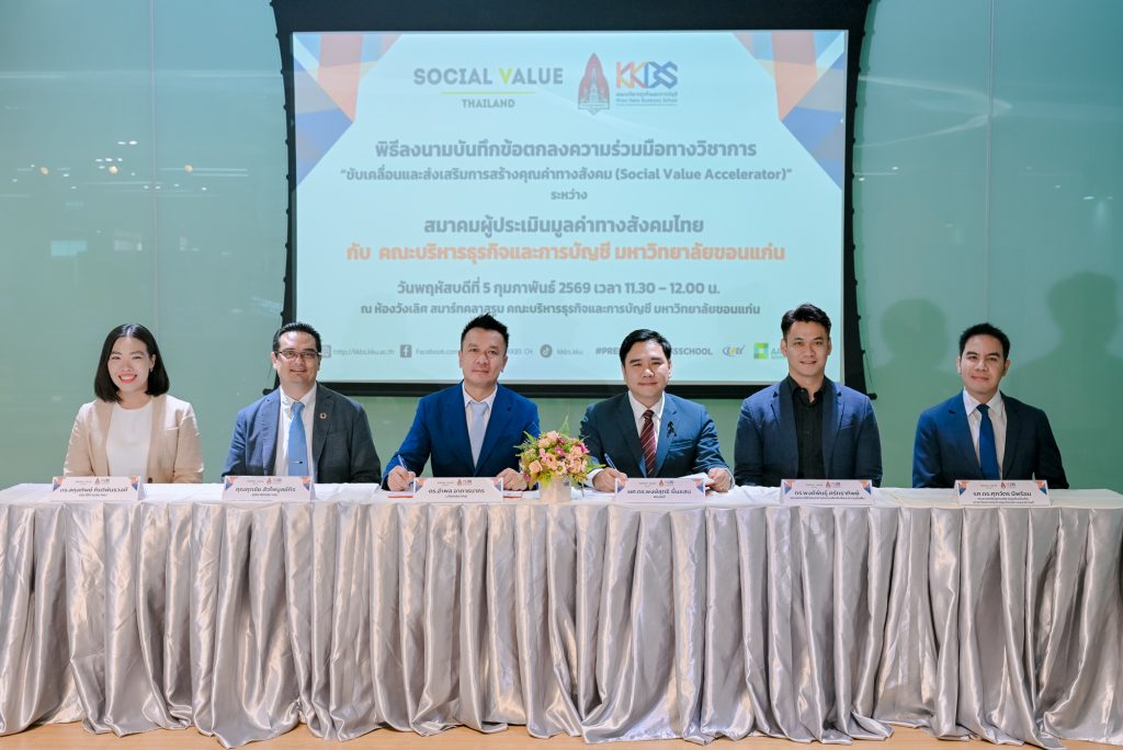 เมื่อวันที่ 5 กุมภาพันธ์ 2569 คณะบริหารธุรกิจและการบัญชี มหาวิทยาลัยขอนแก่น จัดพิธีลงนามบันทึกข้อตกลงความร่วมมือทางวิชาการ (MOU) “ขับเคลื่อนและส่งเสริมการสร้างคุณค่าทางสังคม (Social Value Accelerator)” ระหว่าง มหาวิทยาลัยขอนแก่น โดยคณะบริหารธุรกิจและการบัญชี กับ สมาคมผู้ประเมินมูลค่าทางสังคมไทย โดยในพิธีลงนามได้รับเกียรติจากผู้บริหารทั้งสองหน่วยงาน ประกอบไปด้วย ผู้ช่วยศาสตราจารย์ ดร.พงษ์สุทธิ พื้นแสน คณบดีคณะบริหารธุรกิจและการบัญชี พร้อมด้วย ดร.พงศ์พันธุ์ ศรัทธาทิพย์ รองคณบดีฝ่ายอุตสาหกรรมสัมพันธ์และความยั่งยืน และ รองศาสตราจารย์ ดร.ศุภวัตร มีพร้อม ประธานหลักสูตรบริหารธุรกิจบัณฑิต สาขาวิชาการจัดการธุรกิจบริการและอีเว้นท์ ร่วมด้วย ดร.อำพล อาภาธนากร นายกสมาคมผู้ประเมินมูลค่าทางสังคมไทย คุณศุภชัย สัจไพบูลย์กิจ อุปนายกสมาคมฯ และ ดร.สกุลทิพย์ กีรติพันธวงศ์ เลขาธิการสมาคมฯ