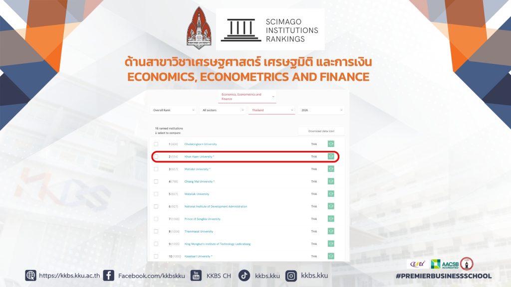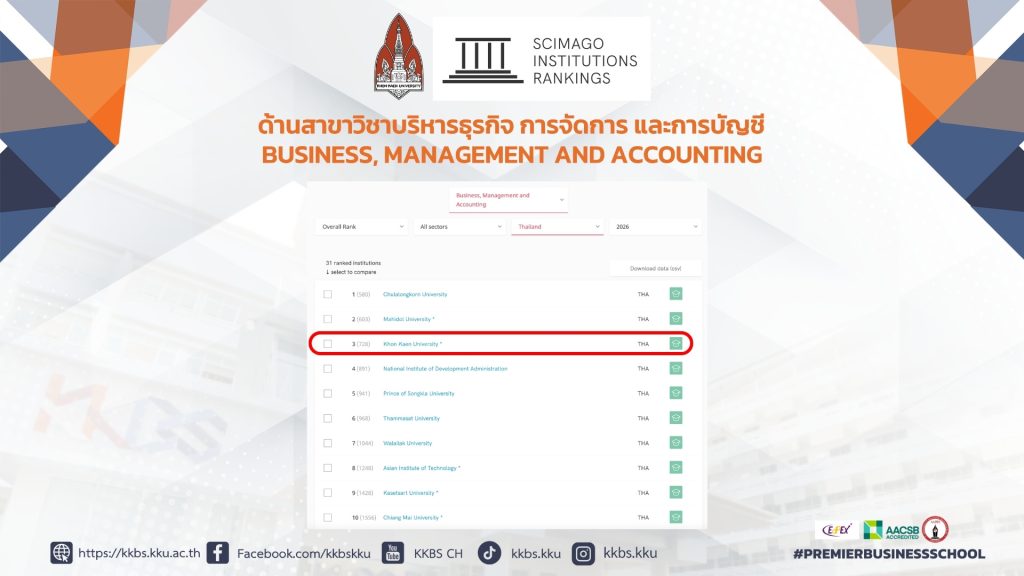 SCImago Institutions Rankings (SIR) ประกาศผลการจัดอันดับสถาบันการศึกษาระดับอุดมศึกษาทั่วโลก ประจำปี 2026 (Scimago Institutions Rankings 2026) ผ่านเว็บไซต์ https://www.scimagoir.com โดยผลการจัดอันดับในระดับประเทศ ประเภทสาขาวิชา Business, Management and Accounting มหาวิทยาลัยขอนแก่นก้าวกระโดดขึ้นอยู่ในลำดับที่ 3 จาก 31 สถาบันการศึกษาในประเทศไทย และประเภทสาขาวิชา Economics, Econometrics and Finance มหาวิทยาลัยขอนแก่นพุ่งขึ้นอยู่ในลำดับที่ 2 จาก 18 สถาบันการศึกษาในประเทศไทย