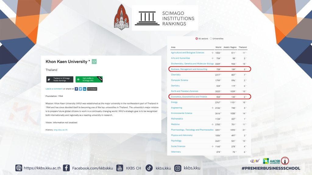 ทั้งนี้ สามารถดูรายละเอียดเพิ่มเติมการจัดอันดับในระดับประเทศ ประเภทสาขาวิชา Business, Management and Accounting ได้ที่ลิงก์ : https://kku.world/x9ie0x และประเภทสาขาวิชา Economics, Econometrics and Finance ได้ที่ลิงก์ : https://kku.world/qmw5ve