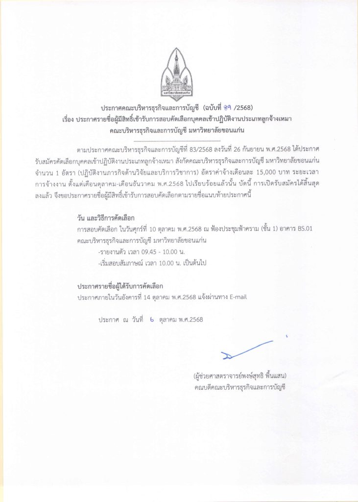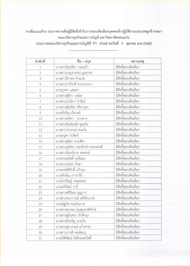 คณะบริหารธุรกิจและการบัญชี มหาวิทยาลัยขอนแก่น ประกาศรายชื่อผู้มีสิทธ์เข้ารับการสอบคัดเลือกบุคคลเข้าปฏิบัติงานประเภทลูกจ้างเหมา สังกัดคณะบริหารธุรกิจและการบัญชี มหาวิทยาลัยขอนแก่น จำนวน 1 อัตรา อัตราค่าจ้างเดือนละ 15,000 บาท (ปฏิบัติงานภารกิจด้านวิจัยและบริการวิชาการ) รายละเอียดที่ https://kku.world/9026hg