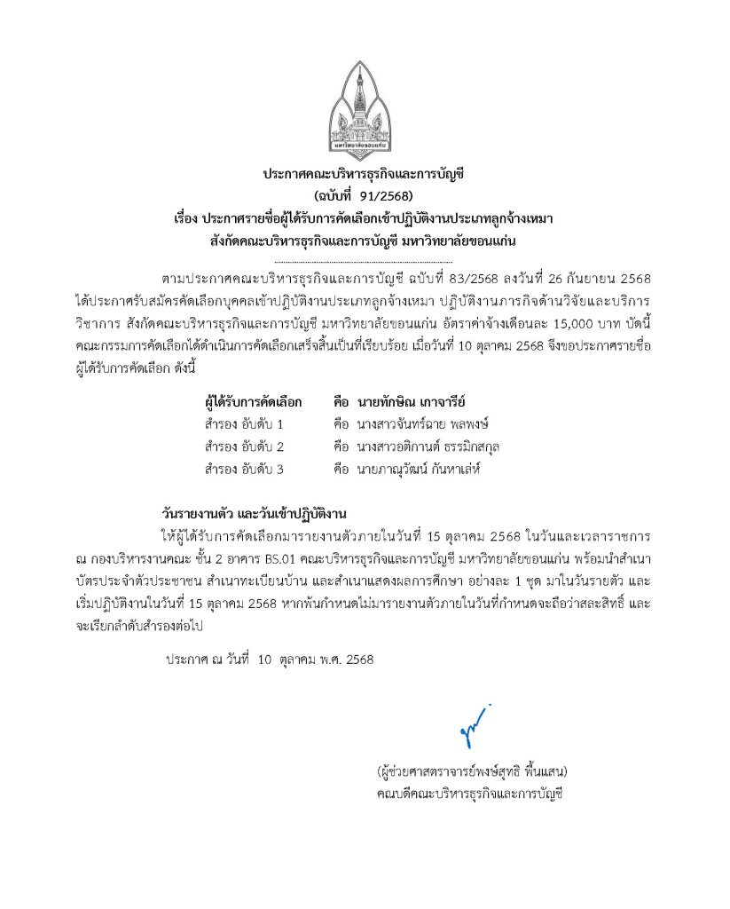 คณะบริหารธุรกิจและการบัญชี มหาวิทยาลัยขอนแก่น ประกาศรายชื่อผู้ได้รับการคัดเลือกเข้าปฏิบัติงานประเภทลูกจ้างเหมา  สังกัดคณะบริหารธุรกิจและการบัญชี มหาวิทยาลัยขอนแก่น จำนวน    1 อัตรา อัตราค่าจ้างเดือนละ 15,000 บาท (ปฏิบัติงานภารกิจด้านวิจัยและบริการวิชาการ) รายละเอียดที่ https://kku.world/h17j2a